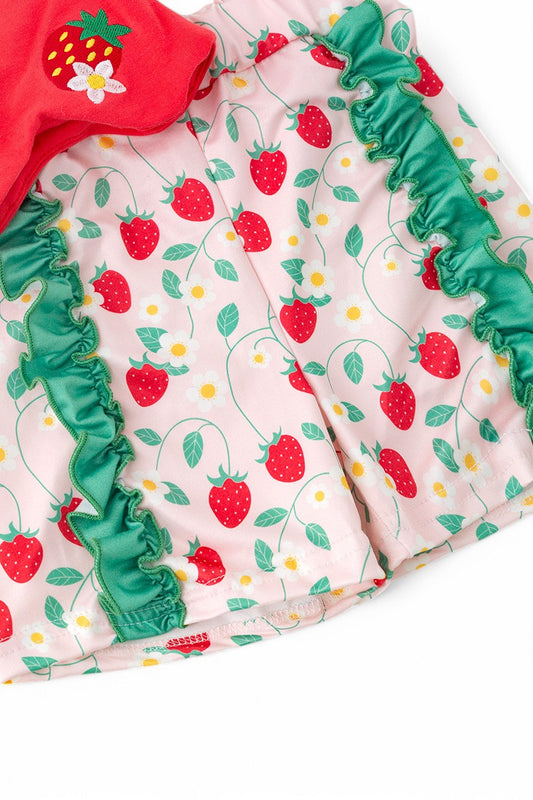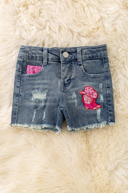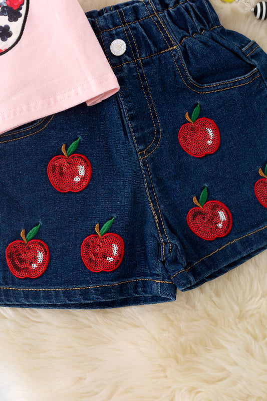 Apple sequins detail on pink shirt and angel sleeve and denim shorts. OFG50723