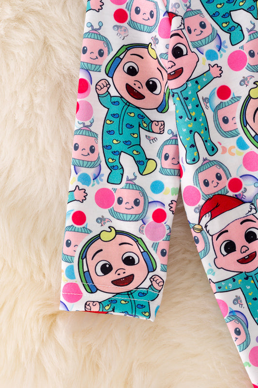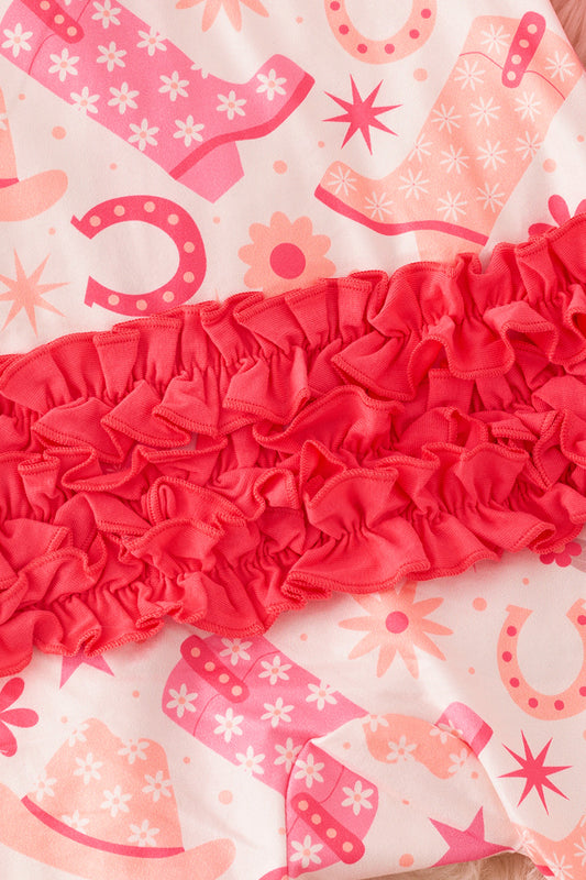 Western cactus, hat printed girls onesie with fold-over footie and ruffle butt.(Western)