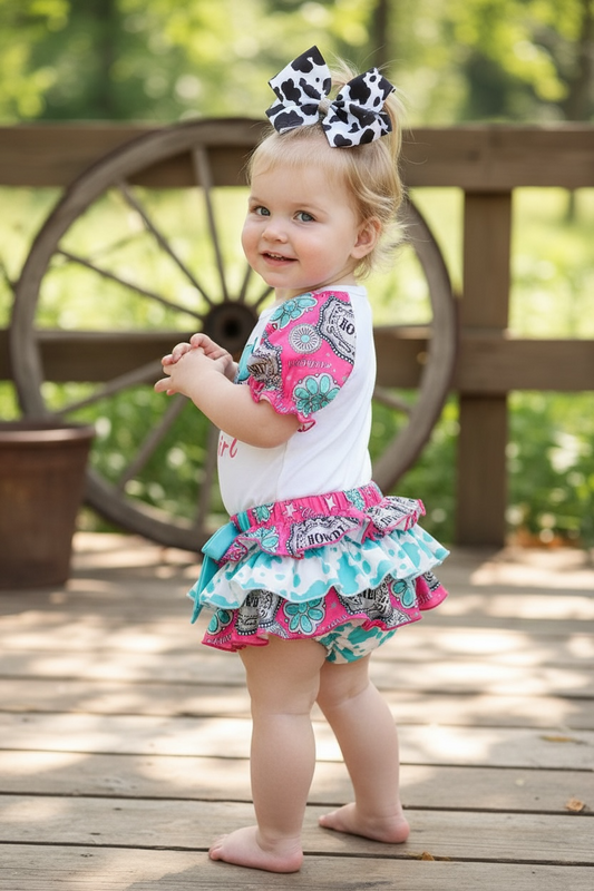 Howdy Cowgirl" multi-printed baby onesie & bloomers.