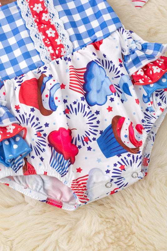 Cup cake printed patriotic baby onesie w/ruffle butt. RPG50579