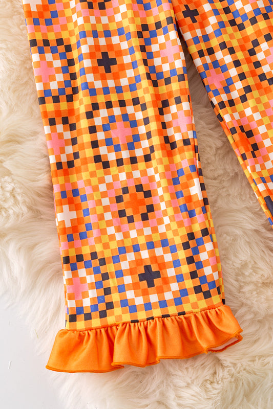 Orange jumpsuit with pumpkin applique and cow printed angel sleeve top.