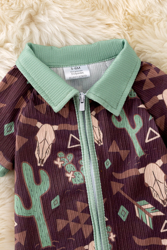 Bull skull & cactus printed on brown baby romper with green trim. RPB50494