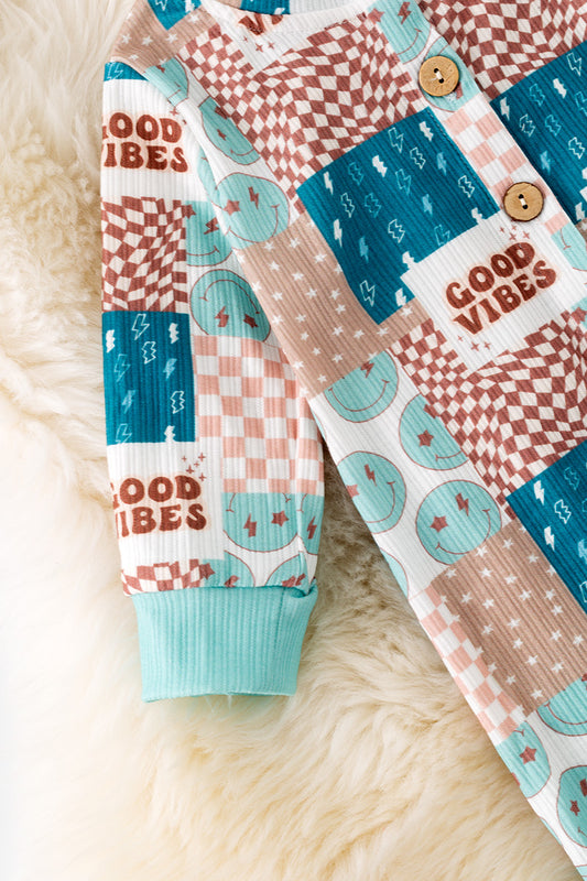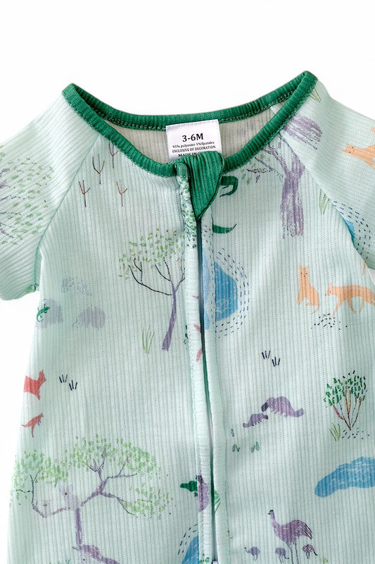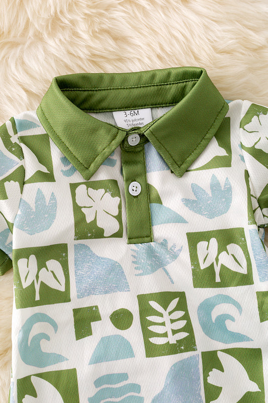 Multi-printed tropical green and blue checker boys baby romper. RPB50288