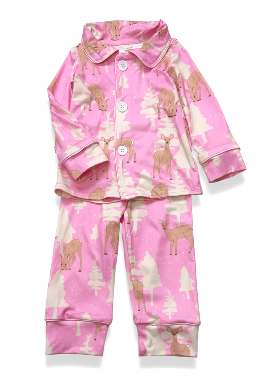 Christmas tree printed on pink girls pajamas.