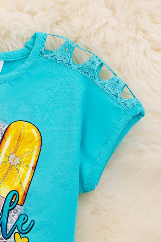 Turquoise "Popsicle Season" graphic tee with embroidered detail on shoulder