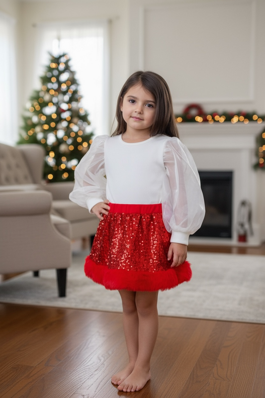 That's it. I'm not going" girls lt. pink tunic with faux fur bell sleeves and bell bottoms.