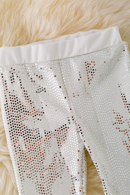 Silver, white shimmery bell pants.