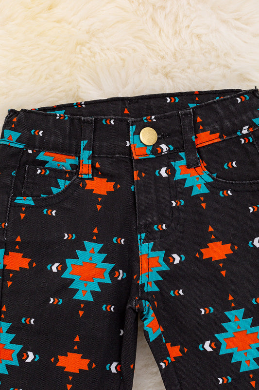 Black Aztec printed boot cut denim pants.