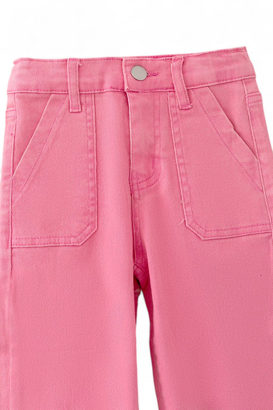 Pink denim pants wide leg jeans with pack pockets.