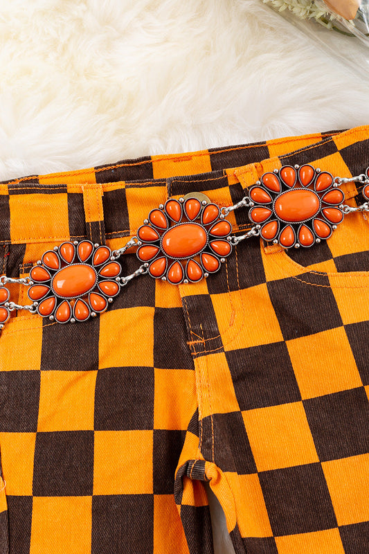 Orange & black checkered denim pants.