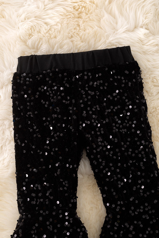 Black sequins bell bottoms with fur trim.