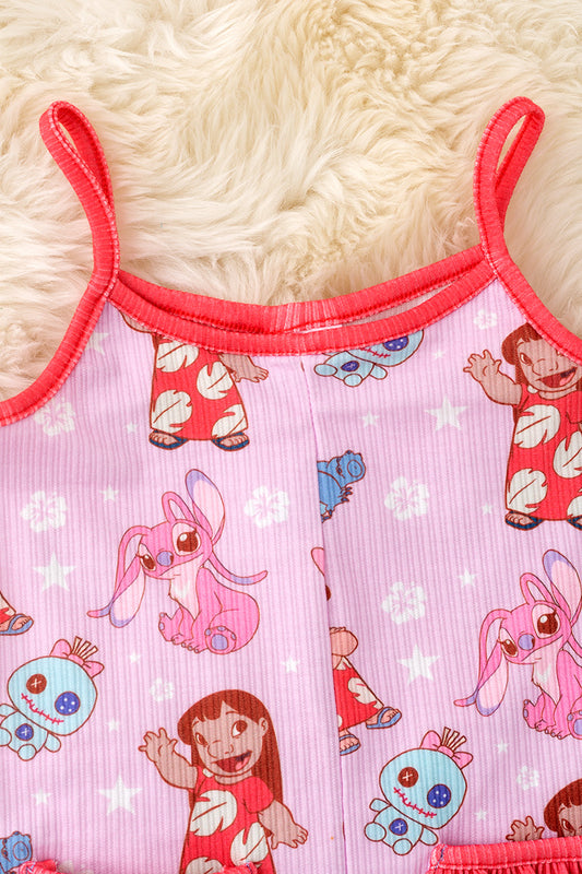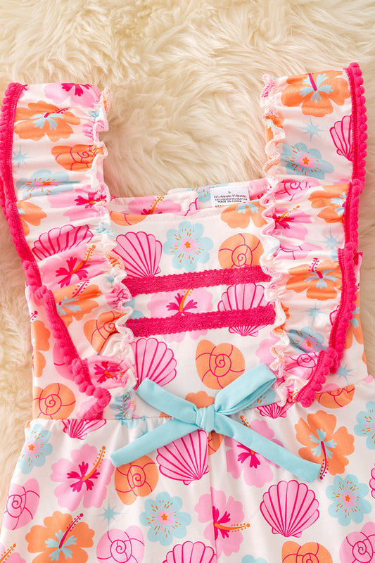 Multi-Color seashell printed girls romper with angel sleeved and fuchsia embroidered detail. PNG50173