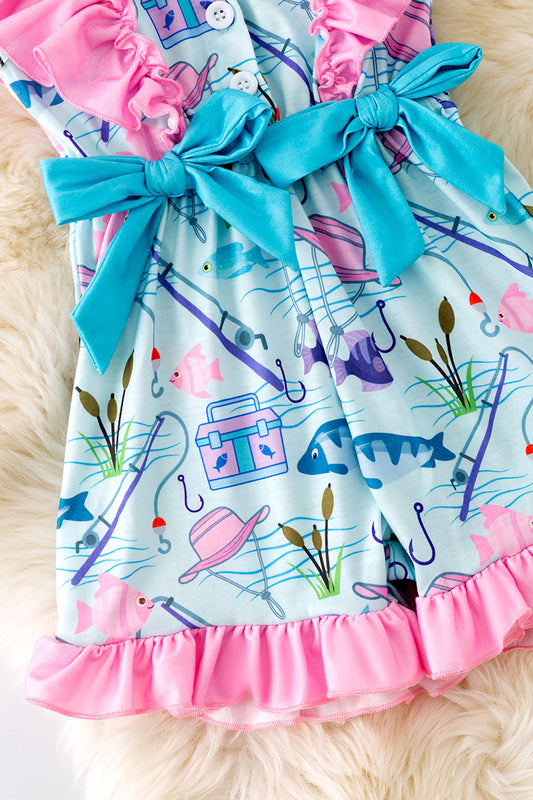 Gone fishing-light blue fish printed romper with ruffle hem. PNG50148