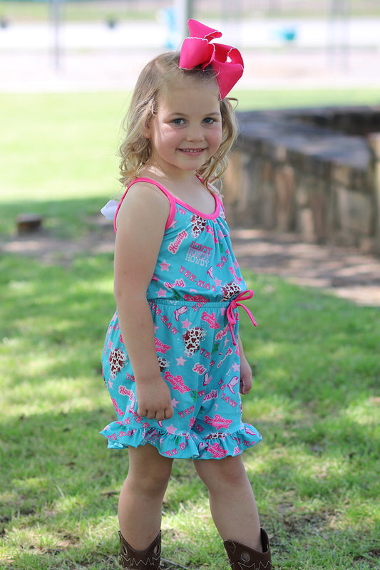 Howdy turquoise romper with fuchsia trim and ruffle hem. PNG50208