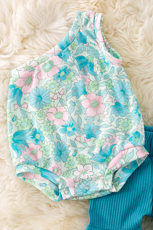 Turquoise Floral cold shoulder ribbed onesie & ribbed bell bottoms.