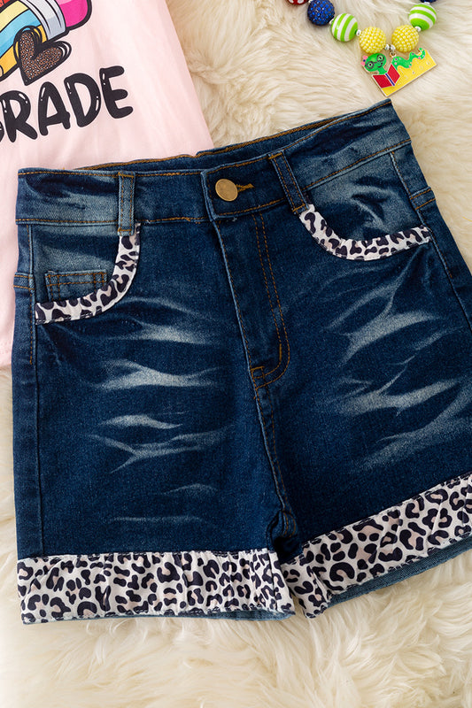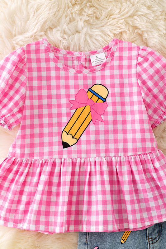 PINK CHECKERED TOP W/ PENCIL APPLICANT AND MATCHING DENIM SHORTS.