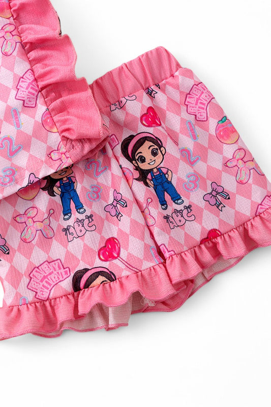 Pink character printed tunic & ruffle pants with blue bow & ruffle trim.