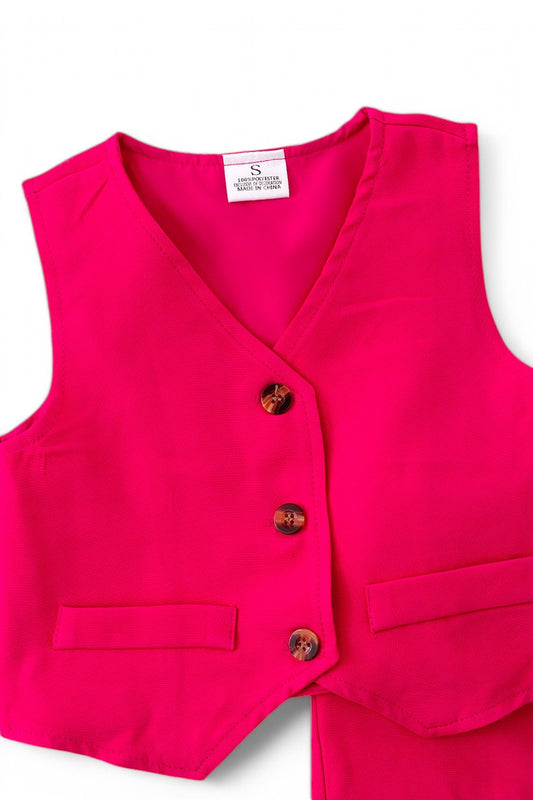 Fuchsia vest with dressy pants.