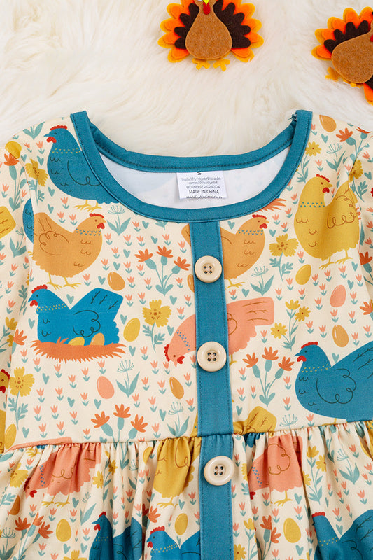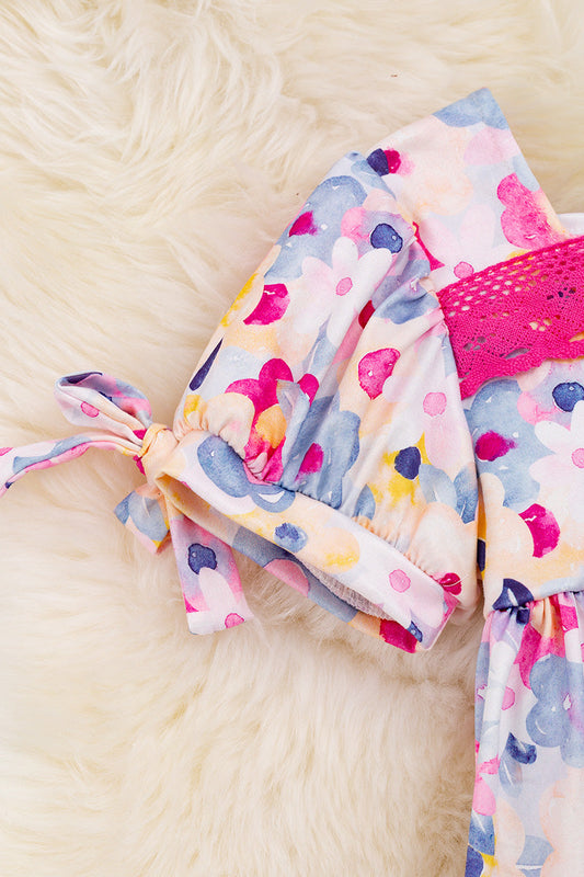Floral Printed Long Sleeve Dress w/ Teal Detail