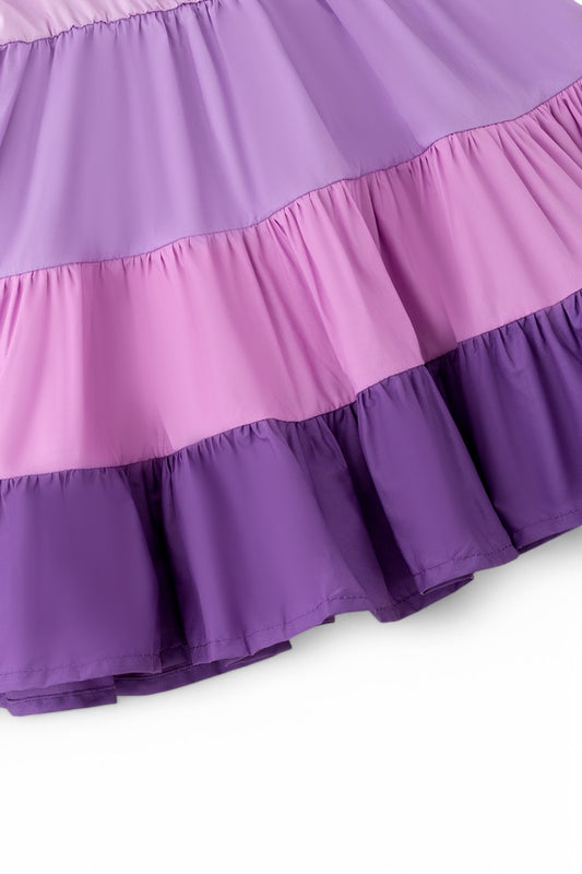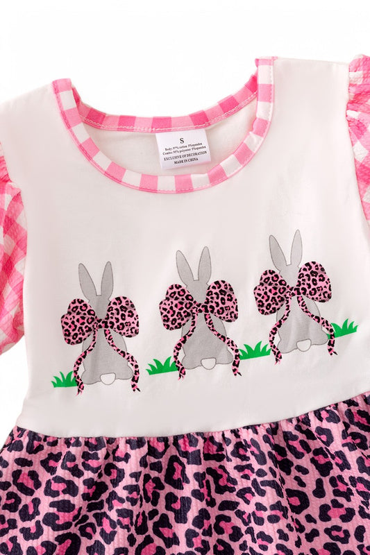 Pink character printed tunic & ruffle pants with blue bow & ruffle trim.