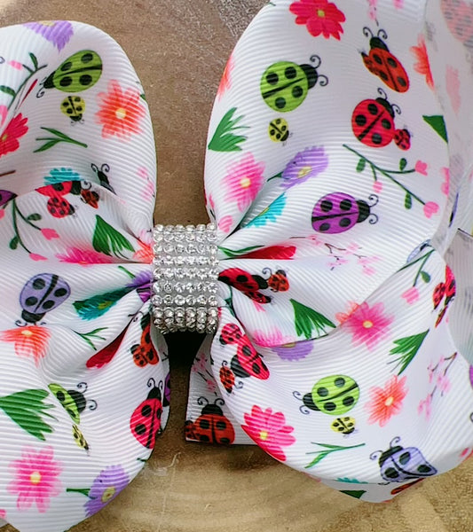 Multi Color lady bug printed double layer hair bow.