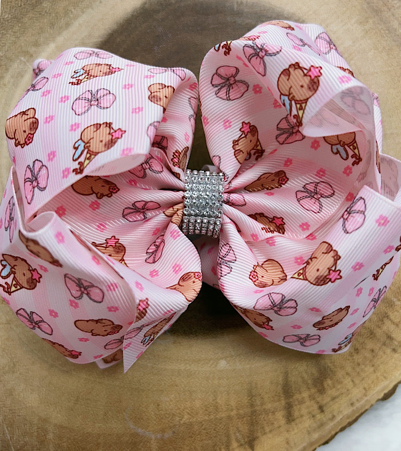 These 6.5-inch wide double-layer hair bows feature sparkling rhinestones and secure alligator clips, combining style with reliable hold.
