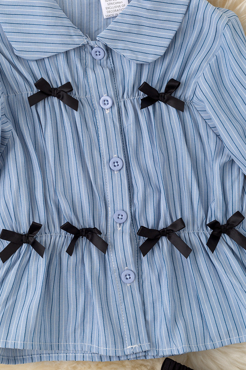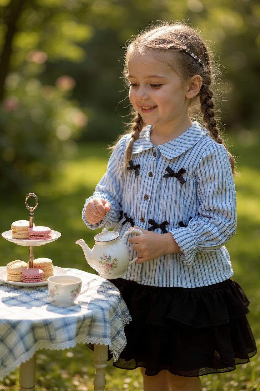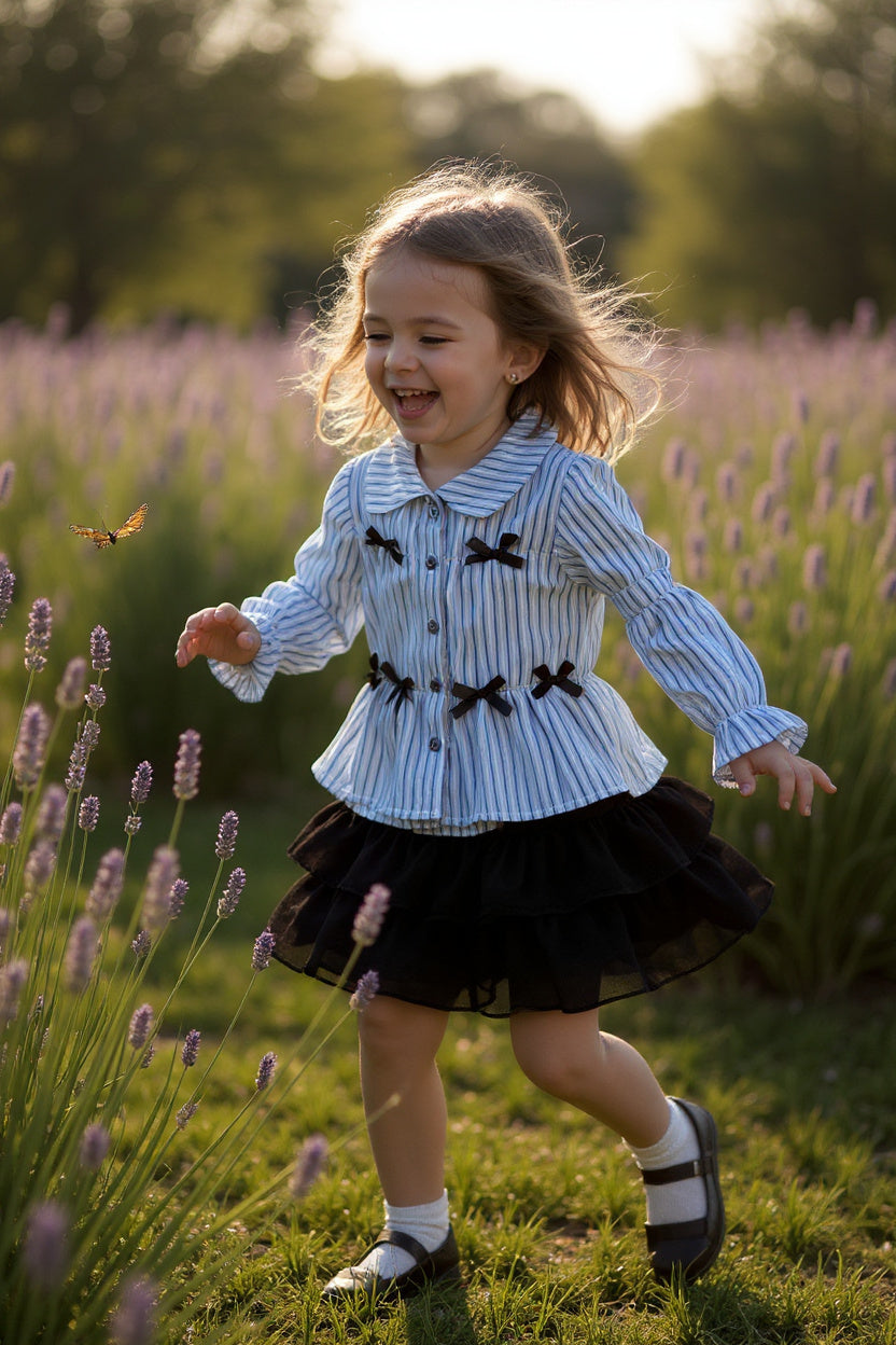 This ensemble features the Coquette bow long sleeve top in blue stripes paired with a chic black layered skirt. The top combines classic patterning with a delicate bow detail for a refined look, while the layered skirt adds depth and movement to the outfit. Together, they create a versatile and stylish set ideal for both casual and dressier occasions, ensuring comfort and elegance for girls.